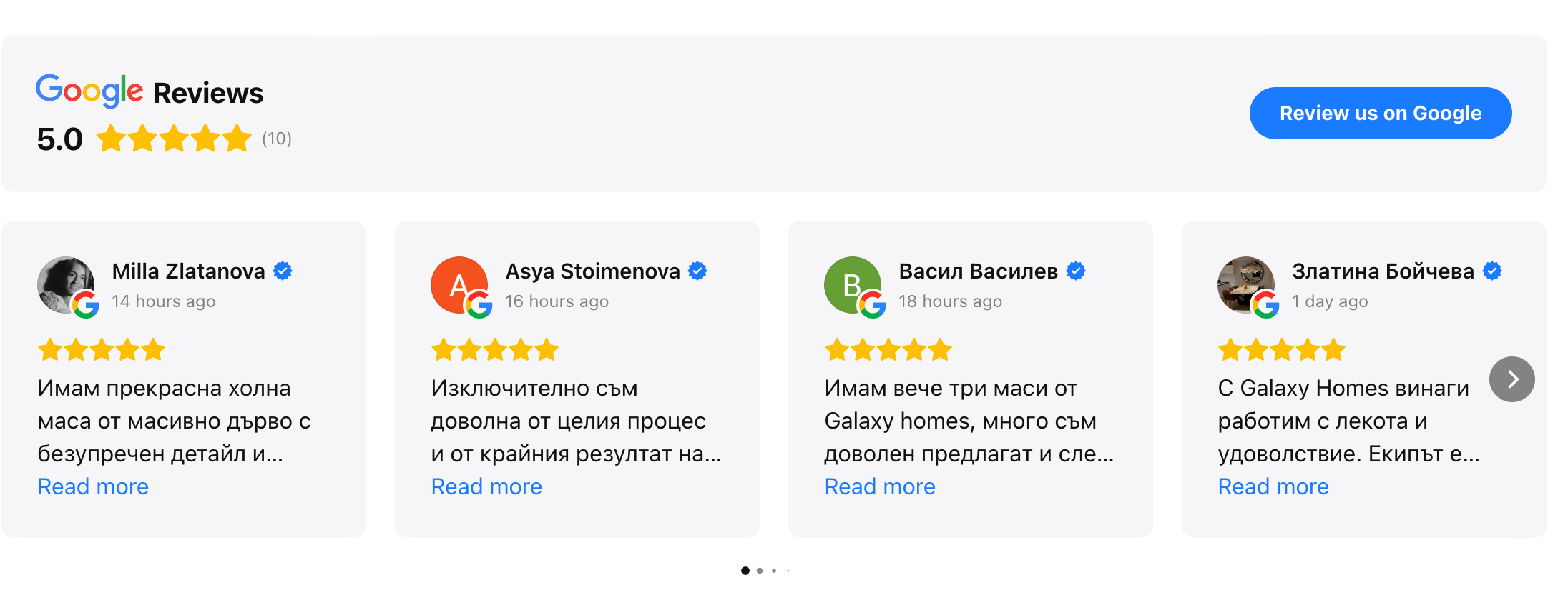 В Galaxy Homes създаваме уникално интериорно обзавеждане, градински мебели и нестандартни аксесоари, изцяло по ваша идея. Работим с естествени и висококачествени материали като дърво, естествени масла и ръчно ковано желязо. Най-голямата ни награда е да видим вашата усмивка и да чуем „По-хубаво е отколкото си го представяхме!“.